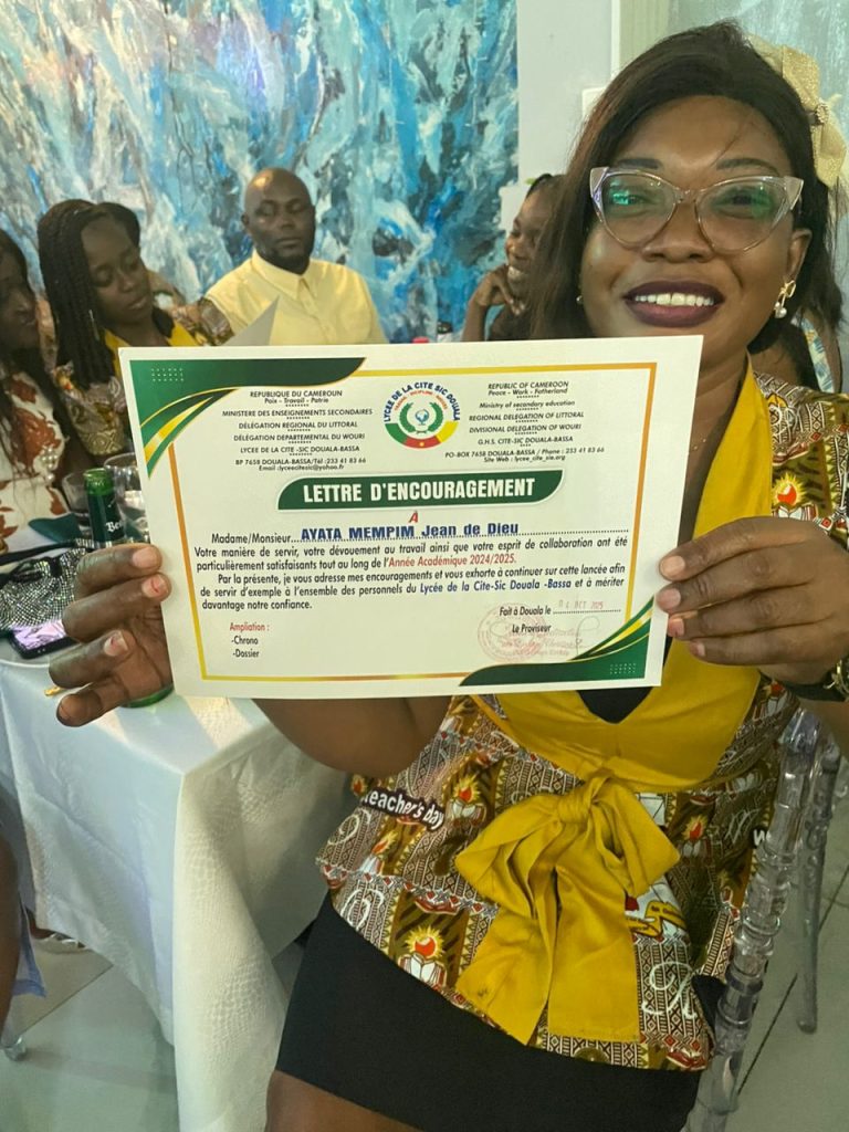 Au sortie du défilé, la célébration a continué au snack bar Star city situé à Bonamoussadi où un cocktail a été offert par Madame le Proviseur à tous les personnels. La cérémonie sera marquée tour à tour par la remise des lettres de motivation aux Enseignants qui se sont distingués durant l’année scolaire 2024-2025. Puis, une table ronde qui a permis de décortiquer le thème de la journée, suivi d’une interprétation de Madame Mandeng, Enseignante d’EPS d’une chanson qui a été composée par elle même et enfin d’un espace danse où les Enseignants ont montré leurs plus beaux pas de danse.